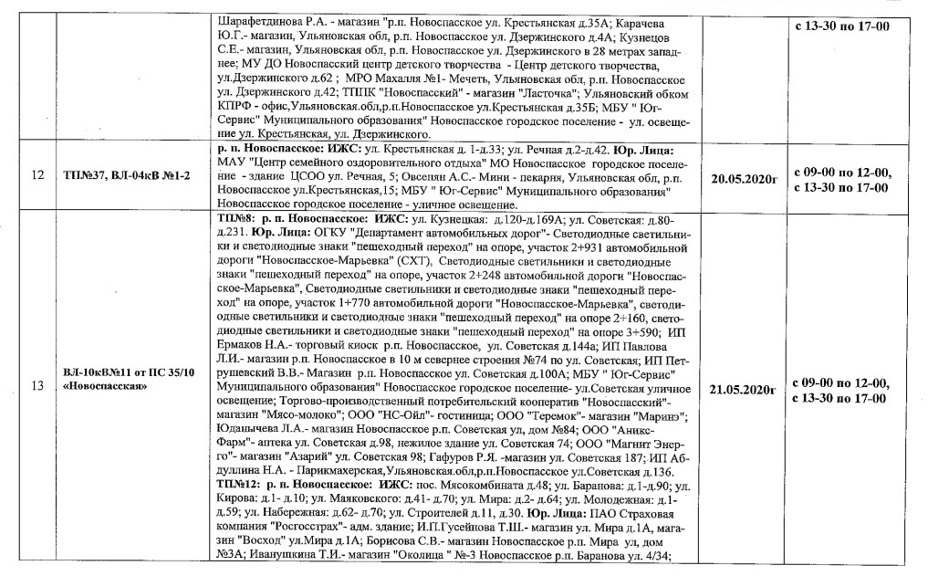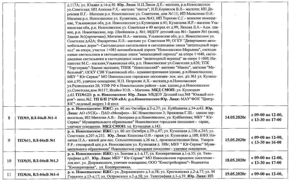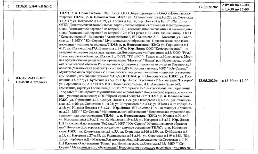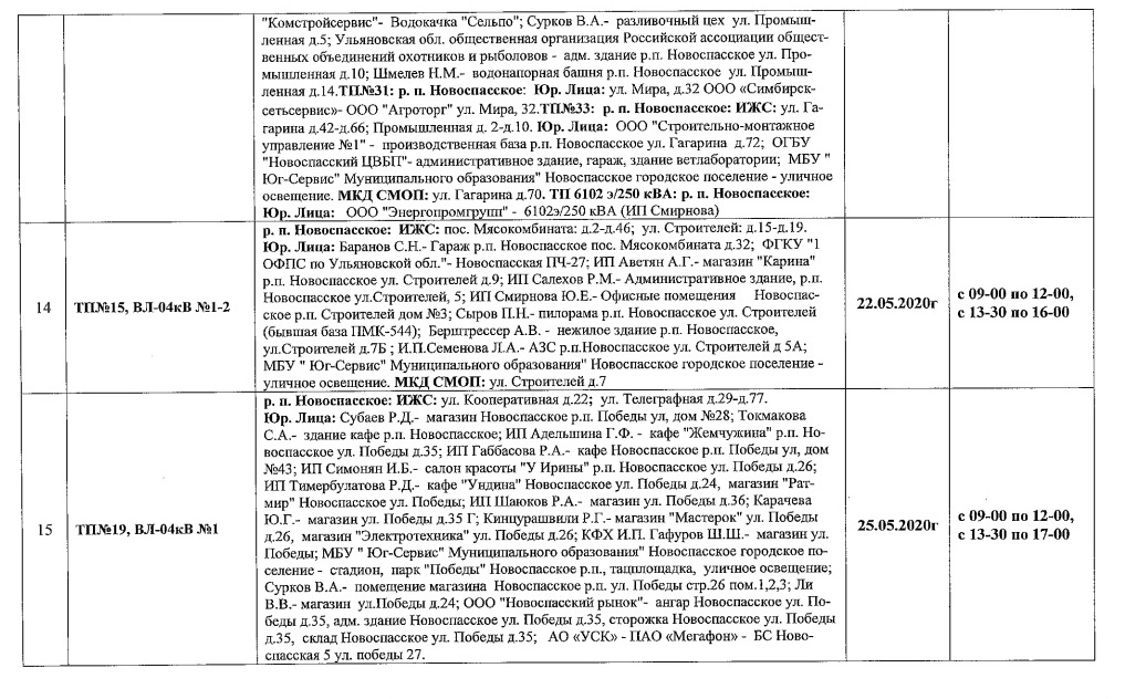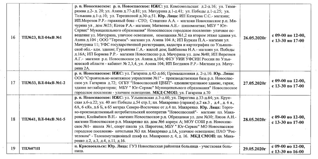 Планы ремонтов РЭС Новоспасского района для проведения ремонтных работ в мае месяце 2020 г.