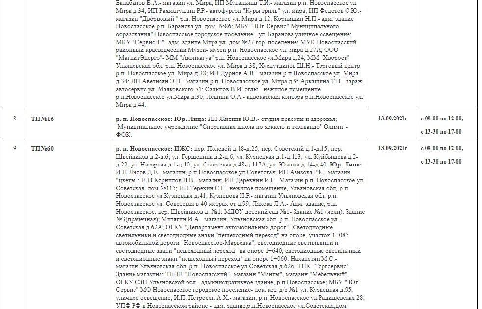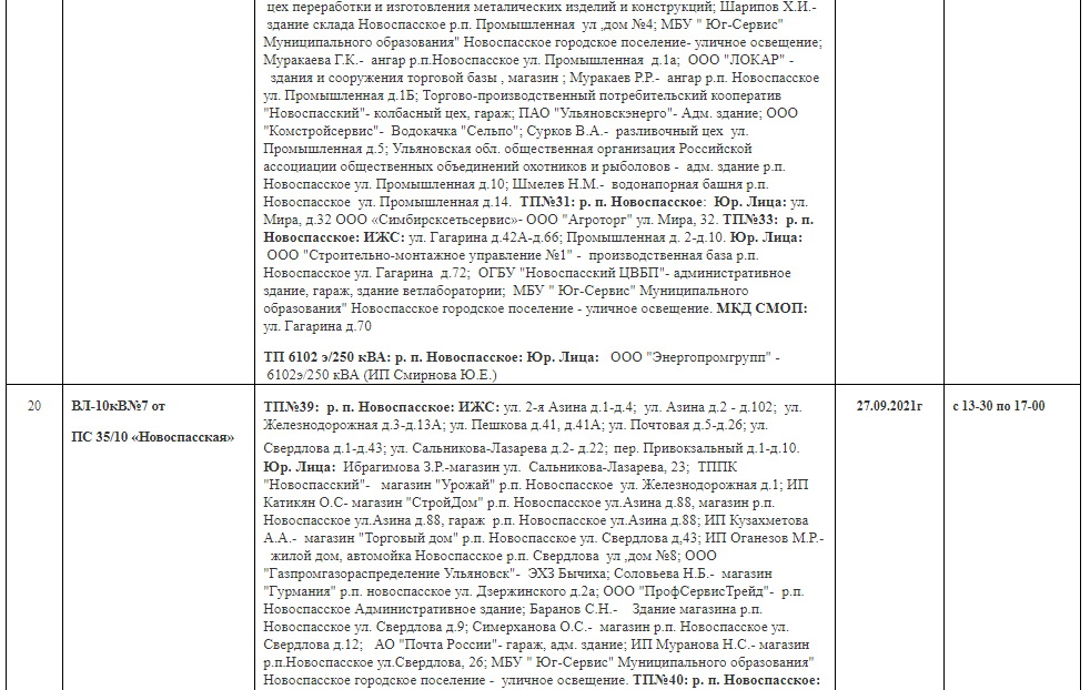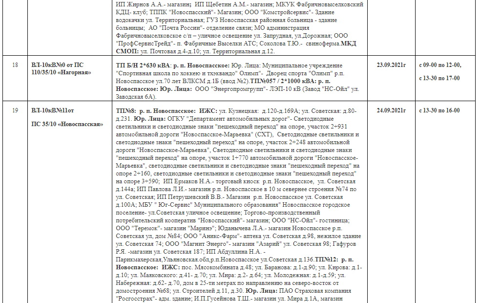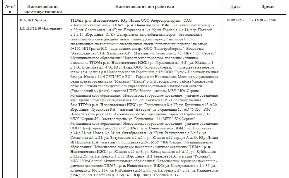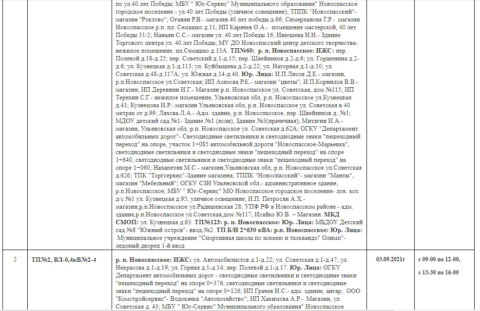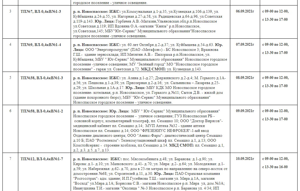 Планы ремонтов РЭС Новоспасского района для проведения ремонтных работ в сентябре месяце 2021 г.