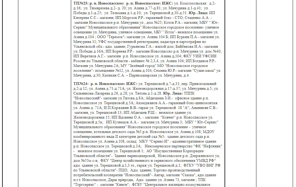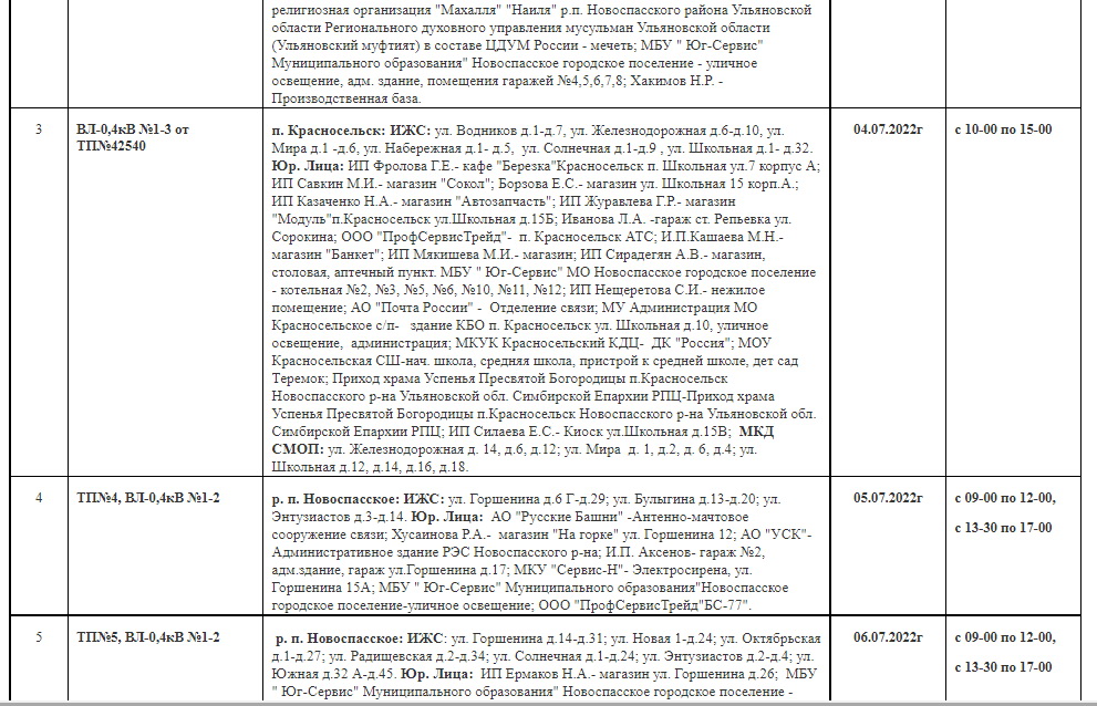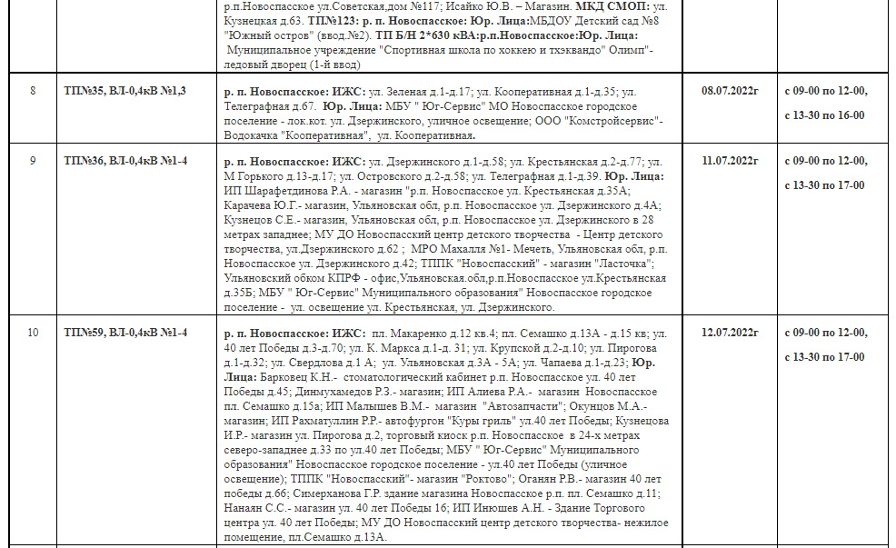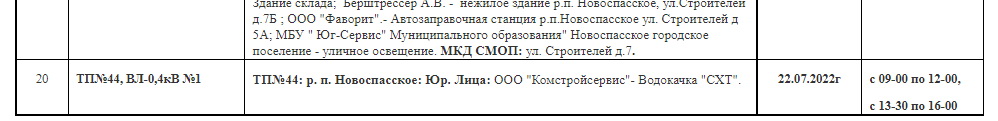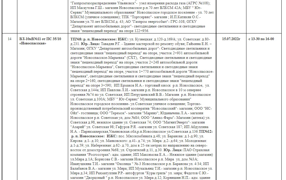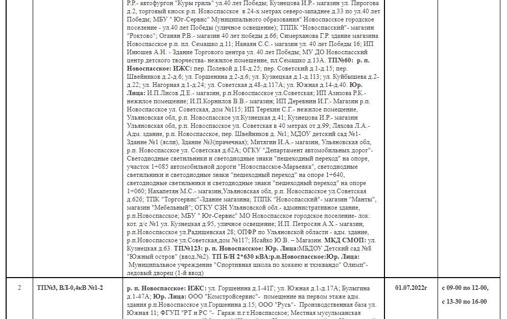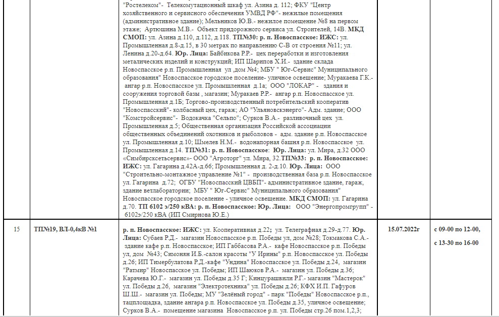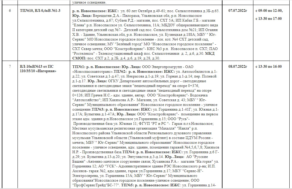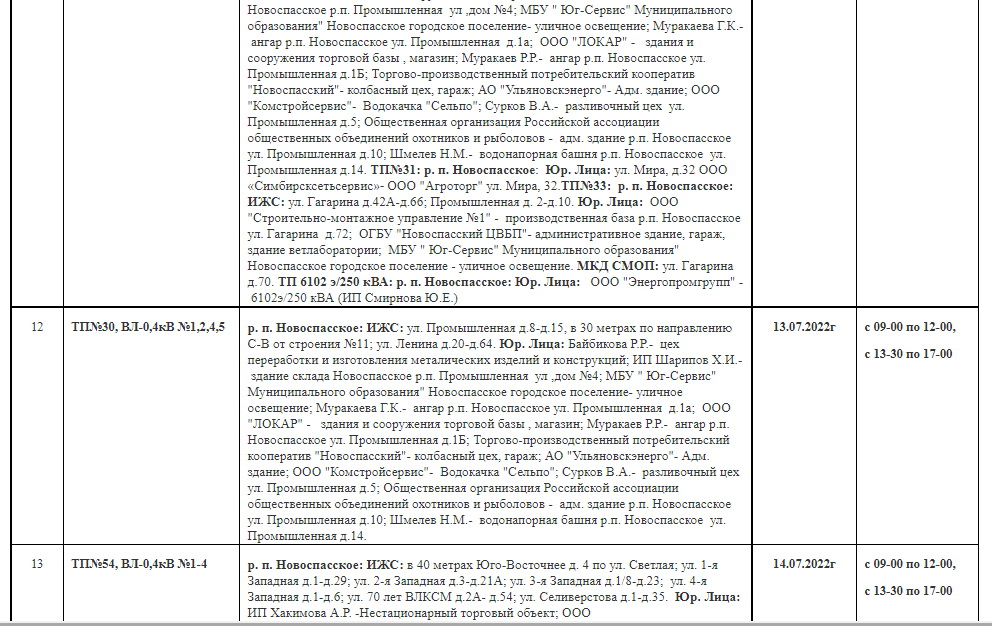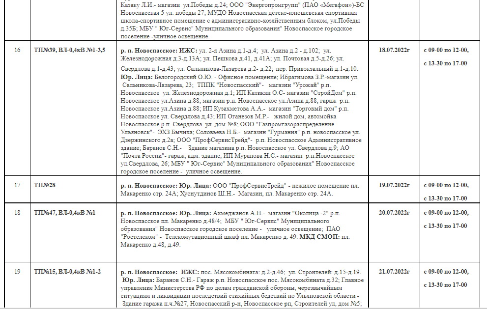 Планы ремонтов РЭС Новоспасского района для проведения ремонтных работ