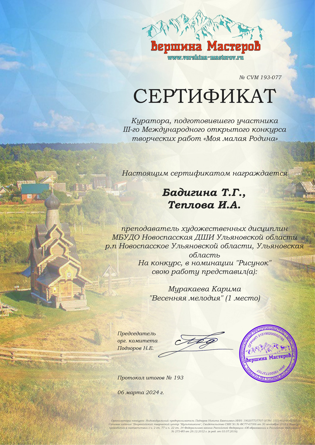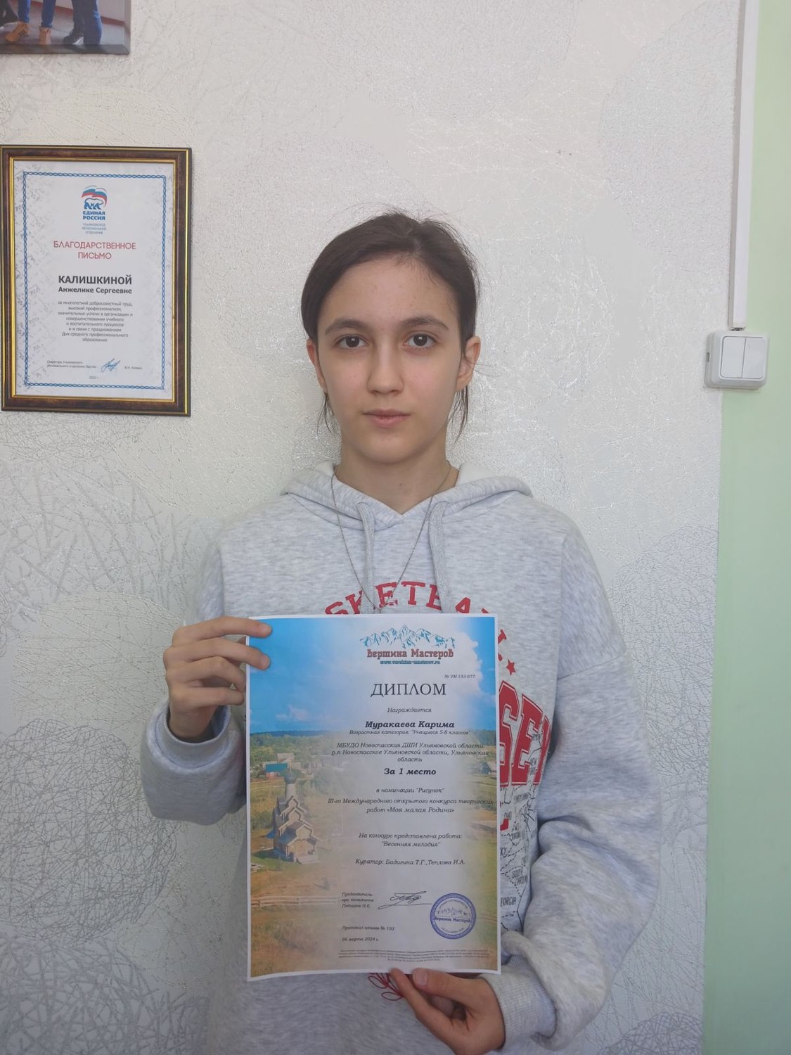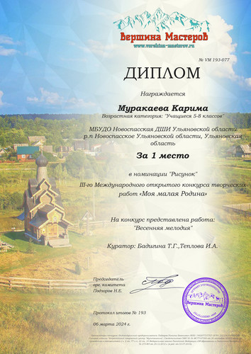 Муракаева Карима, учащаяся Новоспасской ДШИ Ульяновской области, стала победителем III Международного открытого конкурса творческих работ «Моя малая Родина» в номинации рисунок. Её работа «Весенняя мелодия» опубликована на сайте конкурсов «Вершина мастеров».
