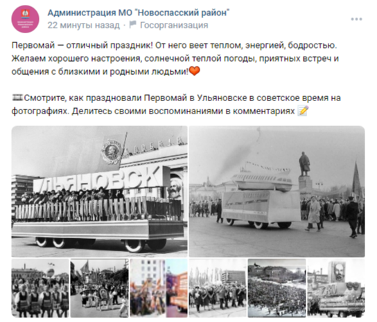 Вместо этого, администрация бодро и можно сказать весело, предлагает жителям поделиться празднованием первомая в советские годы.