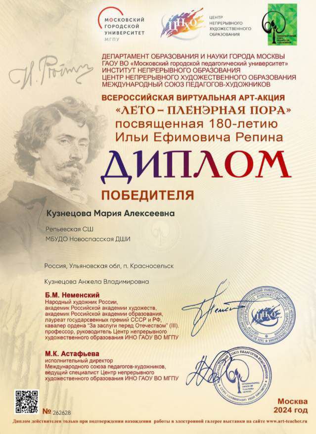 По итогам арт-акции «Лето – пленэрная пора», посвященной 180-летию Ильи Ефимовича Репина, Кузнецова Мария, учащаяся Красносельского внешнего класса, награждена Дипломом победителя конкурса-выставки.