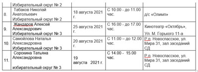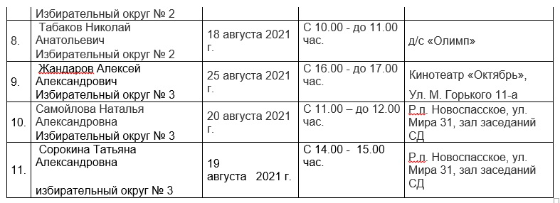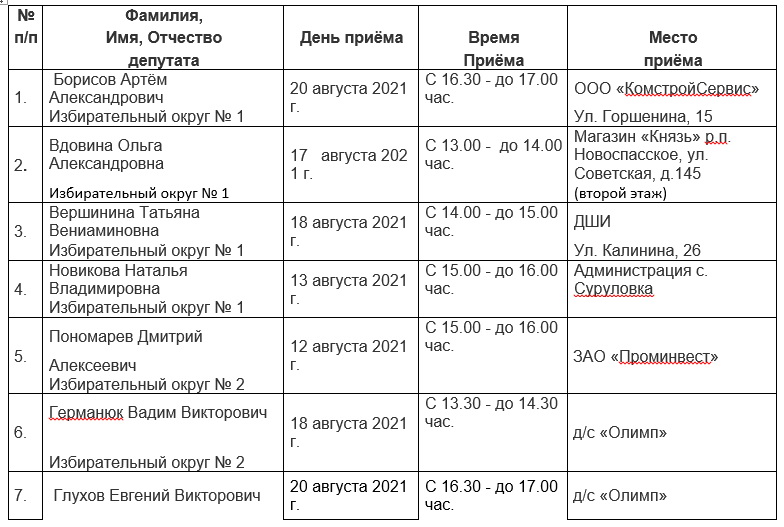 График приёма граждан депутатами муниципального образования «Новоспасское городское поселение» четвёртого созыва на август 2021 г.
