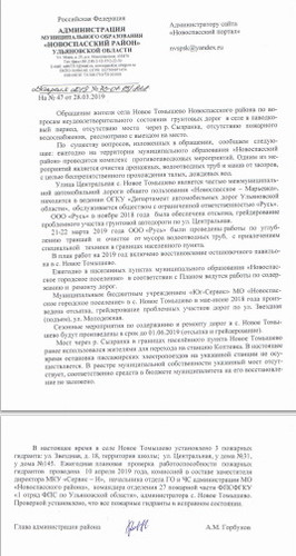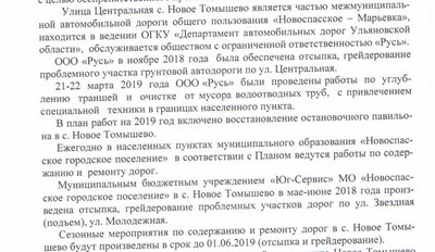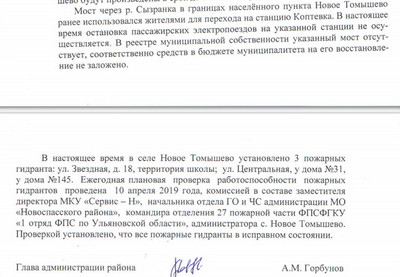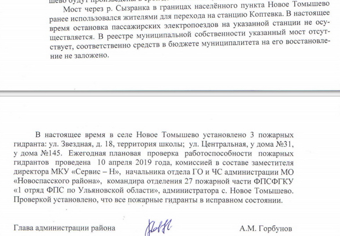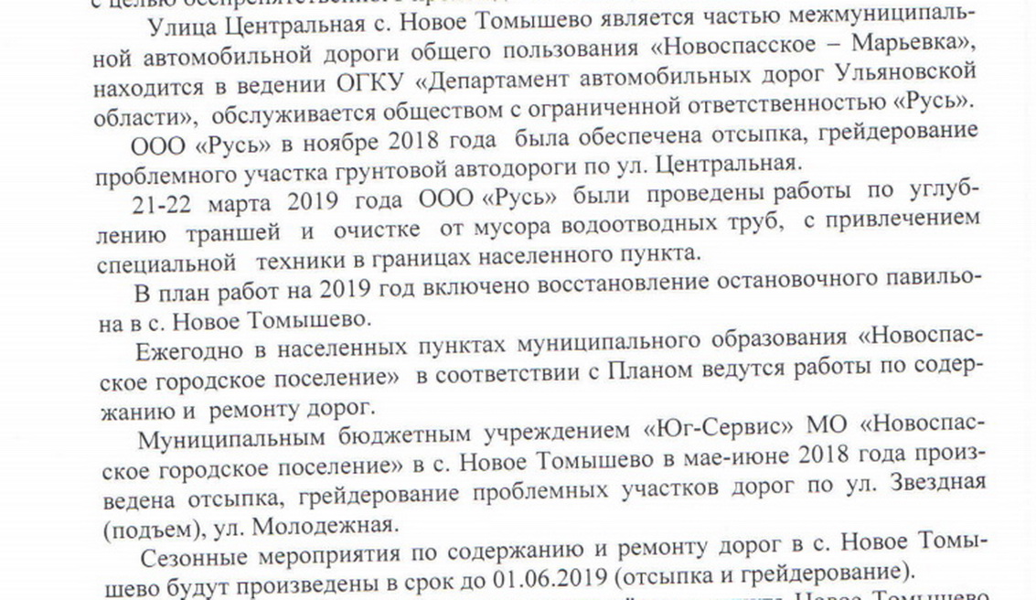Сегодня от администрации МО "Новоспасский район" также получен ответ на обращение жителей села Новое Томышево в "Новоспасский портал", в котором они указывали на состояние грунтовых дорог, отсутствие пожарного гидранта и моста через реку Сызранка.