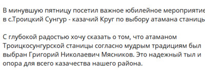 Абсурдность и клоунство ряженых,заметно не вооруженным взглядом,Григорий-подьесаул(капитан),Коленька(сынок)-войсковой старшина(полковник),старше звание чем у папы,чтоб дослужиться до звания как у Коленьки,нужно иметь 14 лет выслуги в казачьем движение,казачья община в Сунгуре 10 лет.Ничего удивительного,кем хотят тем и становятся а про наградные планки и говорить не приходится,у Брежнева меньше было.