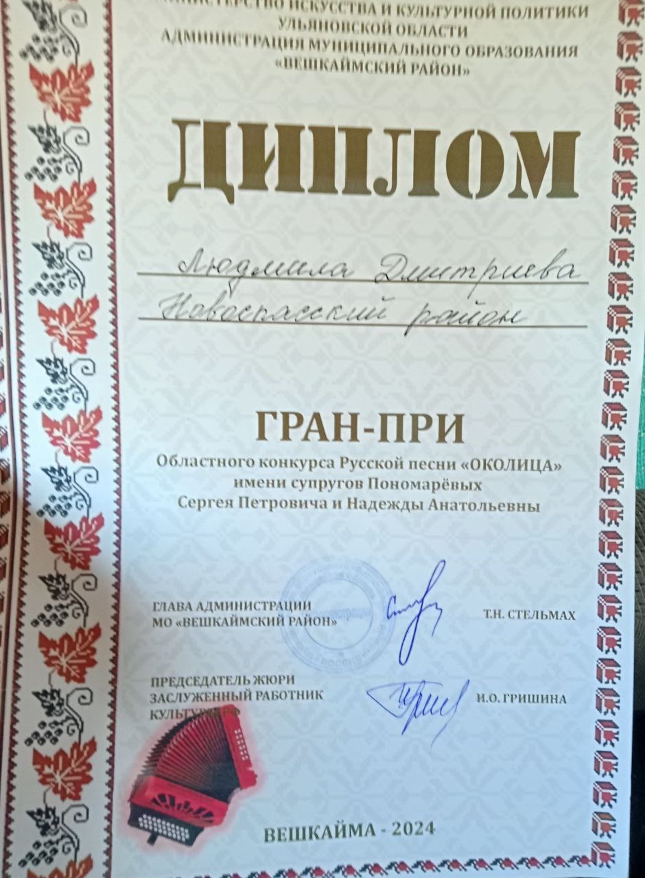 Дмитриева Людмила Александровна, преподаватель Новоспасской ДШИ, получила ГРАН-ПРИ в номинации "сольное пение" Первого областного конкурса русской песни "Околица" имени супругов Понамарёвых Сергея Петровича и Надежды Анатольевны.