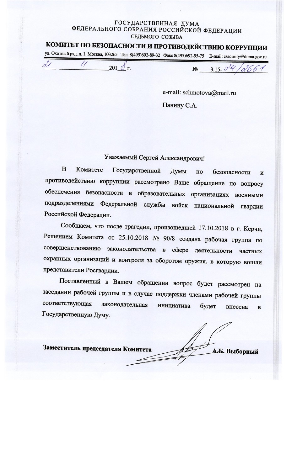 В Комитете Государственной Думы по безопасности и противодействию коррупции рассмотрено обращение по вопросу обеспечения безопасности в образовательных учреждениях, военными подразделениями Федеральной службы войск национальной гвардии Российской Федерации.