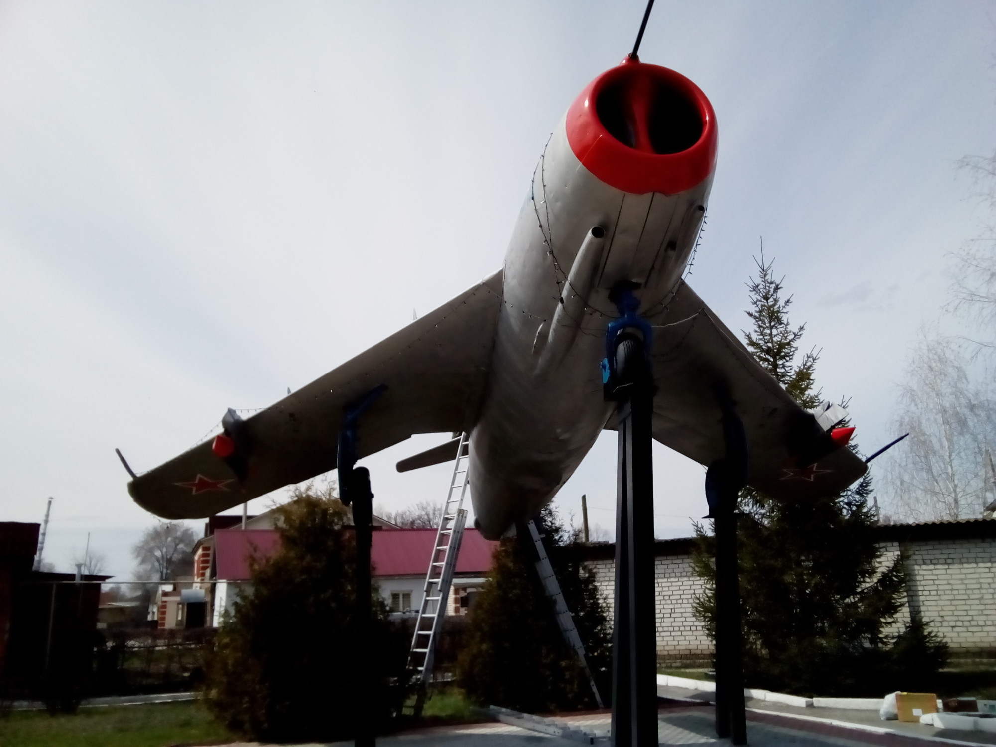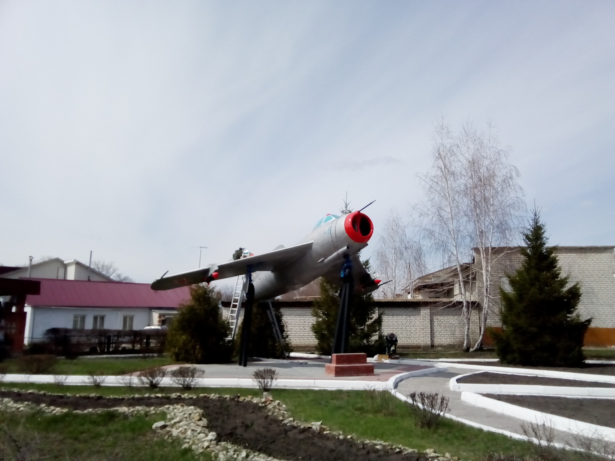 Сегодня, 30 апреля, не смотря на то, что объявлен выходным днём, но в ООО Центротех АЗС решили накануне праздника Весны и труда - 1мая, привести в порядок памятник Миг-15, расположенный в сквере 300-летия поселению. Самолёт приобрёл раскраску - новую, яркую.