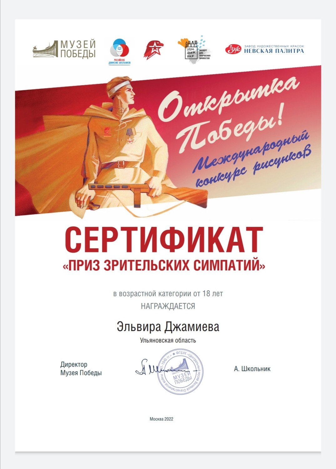 При голосовании творческая работа Джамиевой Э.А. победила в номинации «ПРИЗ ЗРИТЕЛЬСКИХ СИМПАТИЙ» международного конкурса рисунков Музея Победы.