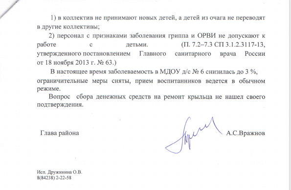 Как сказал известный герой фильма Неуловимые мстители, последнее предложение в данном ответе полная "Брехня", крылечки отремонтированы за родительские деньги, ну чем черт не шутит, может администрация тоже какую то часть вложила, но ведь перед родителями никто не отчитался, это не принято нигде ни в дет.садах, ни в школах, а Дружининой О.В. надо быть повнимательнее когда ответ готовит, а вот работникам прокуратуры это очень легко проверить можно, встать в штатской форме у садика утром, когда скопление родителей и провести анонимный опрос, и все будет ясно и понятно