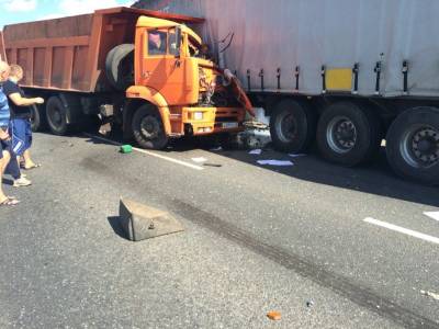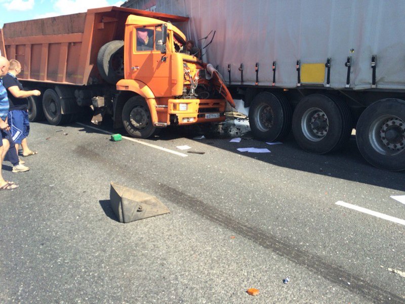 В результате аварии водитель самосвала оказался зажат в покореженной кабине своего грузовика. Водитель фуры MAN самостоятельно вышел из машины и помогал отключить аккумулятор у разбитого КамАЗа.
