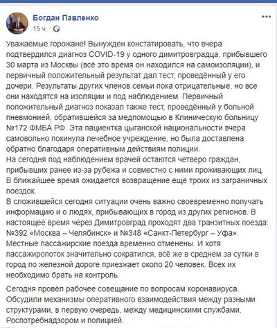Вчера же, в Димитровграде появилось три человека с подозрением на коронавирус, первичные тесты дали положительные результаты. Одна пациентка сбежала из больницы, ее пришлось возвращать силами полиции.