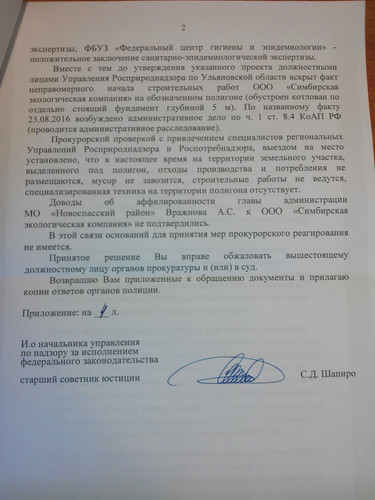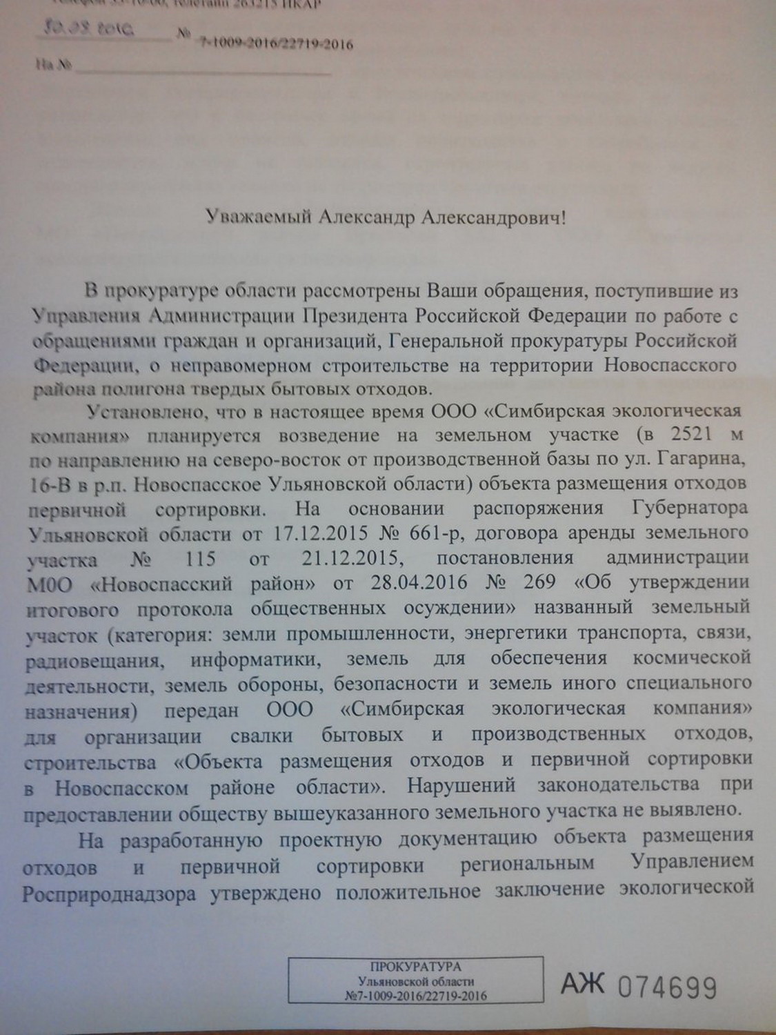 Сегодня председатель экологической палаты Ульяновской области Александр Брагин предоставил порталу ответ на его обращение в Управление президента из областной прокуратуры.