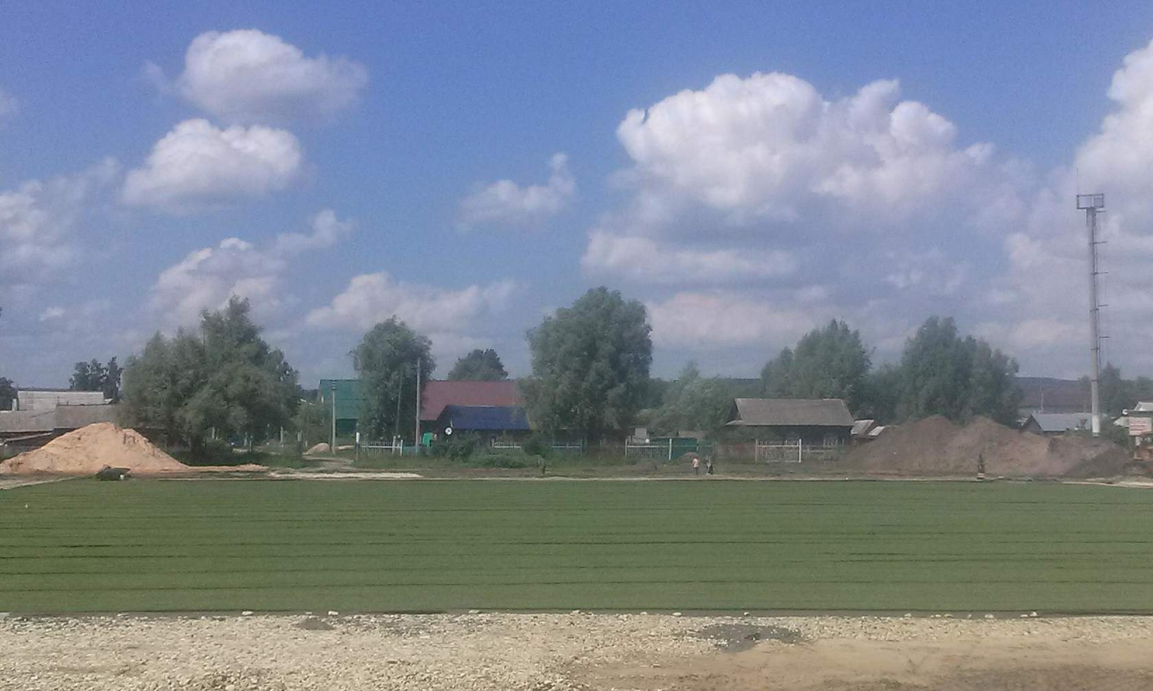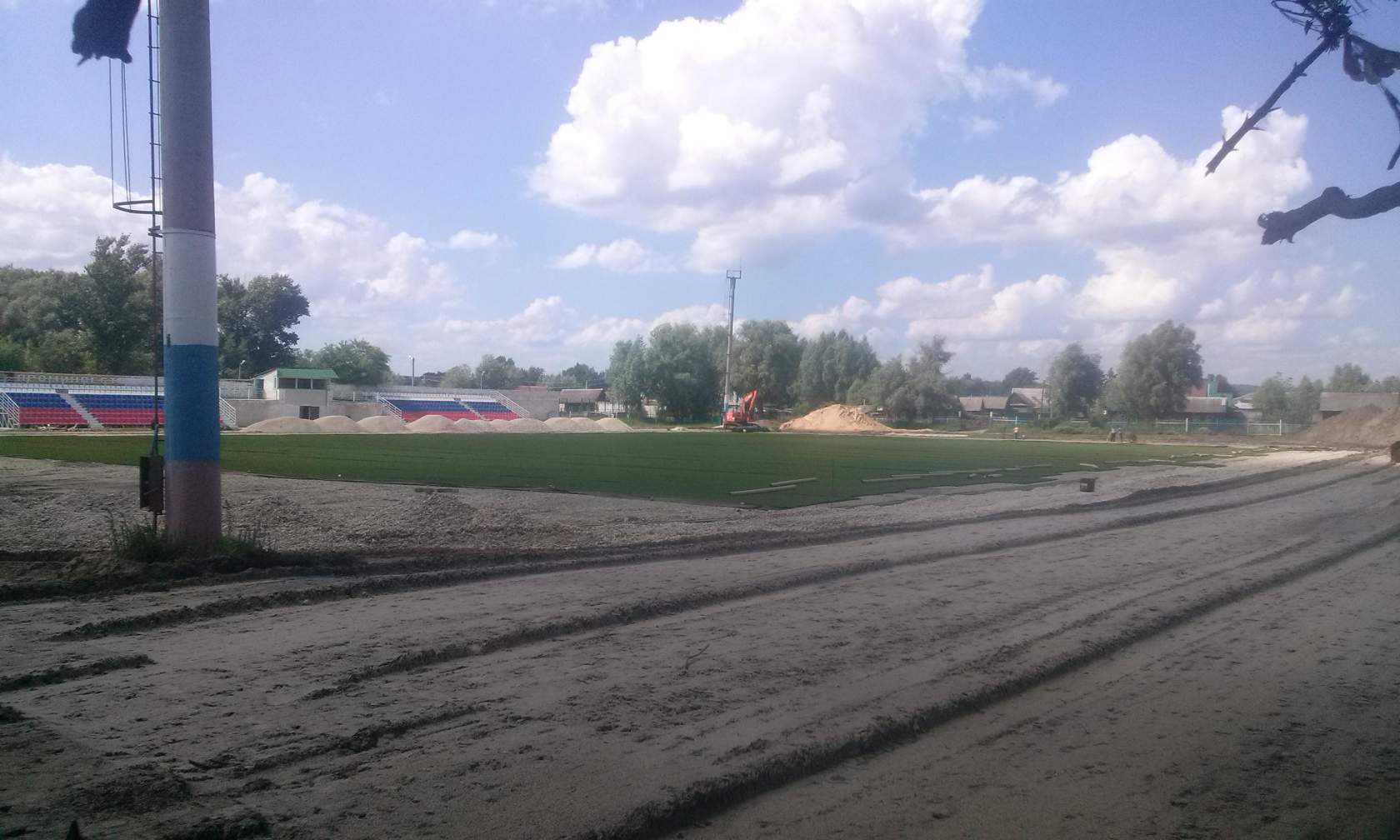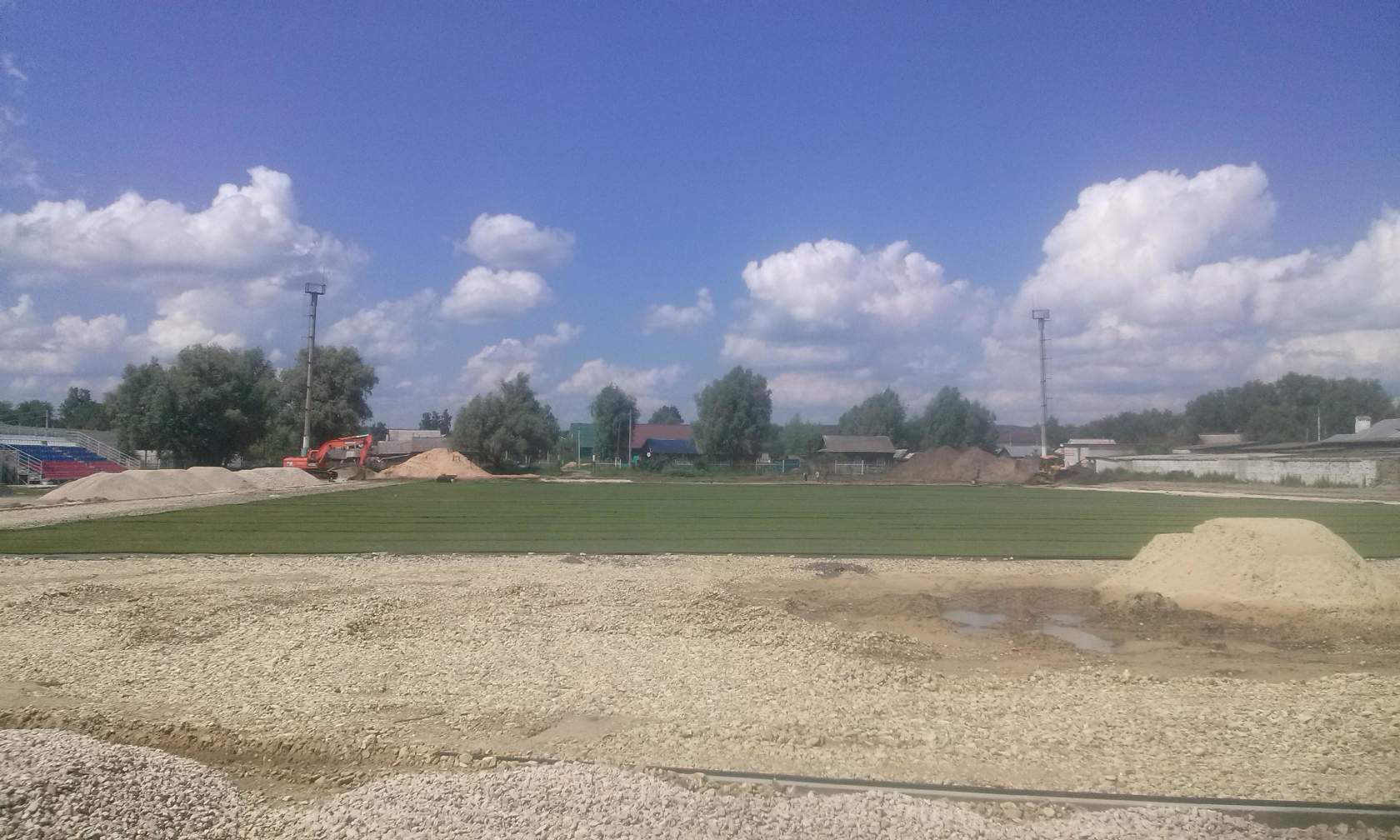 Как видно поле почти уложено, но работ ещё предстоит много: сделать беговую дорожку, как минимум накрыть крышей трибуны. |