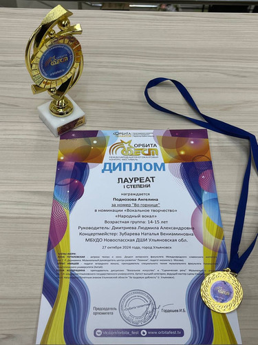Поздравляем Поднозову Ангелину с победой в международном многожанровом конкурсе-фестивале "Орбита ФЕСТ", который состоялся в Ульяновске 27 октября.