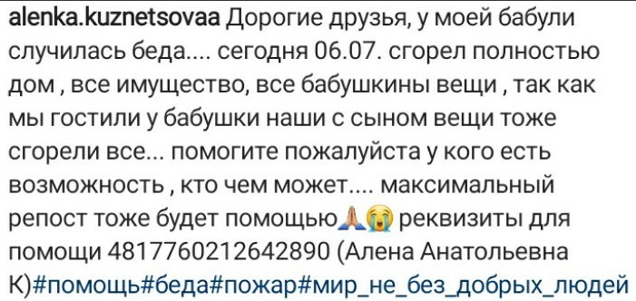 До приезда пожарных люди пытались сами потушить пламя. Однако, несмотря на все усилия, огонь полностью уничтожил дом. Пожилая хозяйка осталась без крыши над головой. Пока причины возгорания еще предстоит выяснить. Сейчас погорельцам крайне необходима помощь. Все неравнодушные могут позвонить по телефону: +7 (937) 870-10-09 а также на карту Сбербанка, указанную на фото.