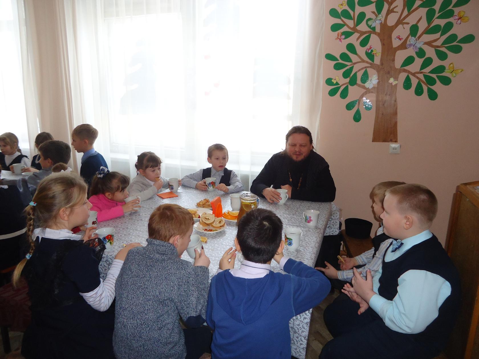 Добрая встреча завершилась за чаепитием. На рождество принято дарить подарки, поэтому все участники получили сладкие наборы от настоятеля храма отца Серафима.