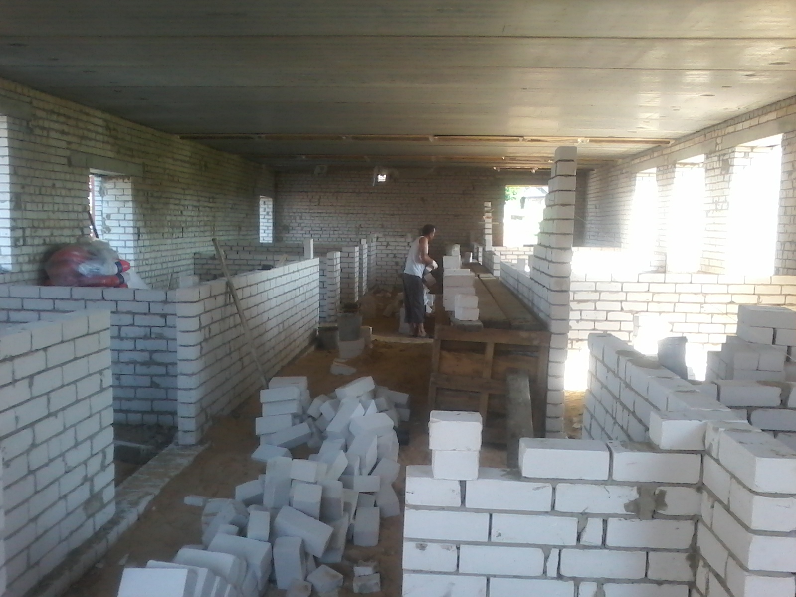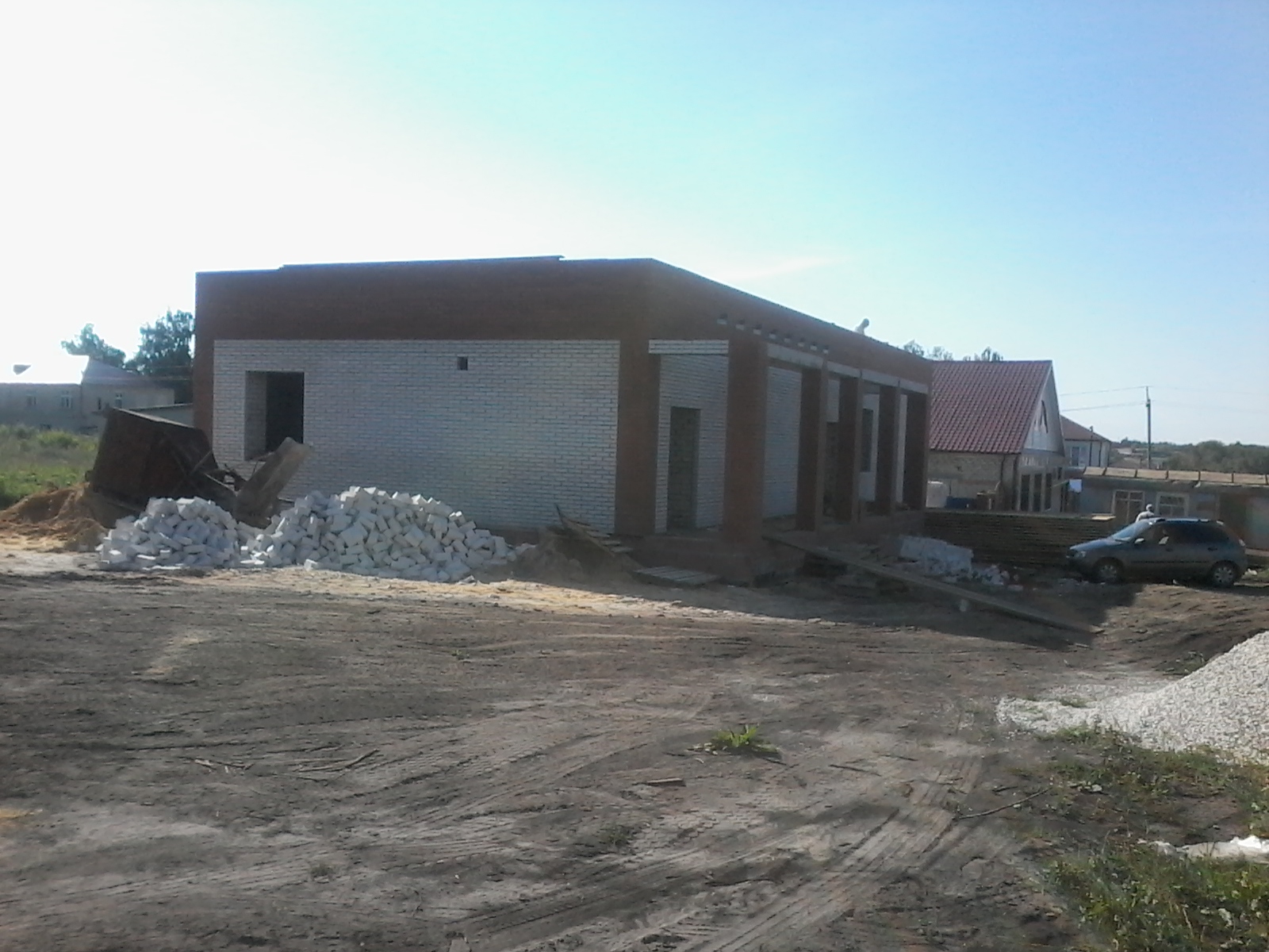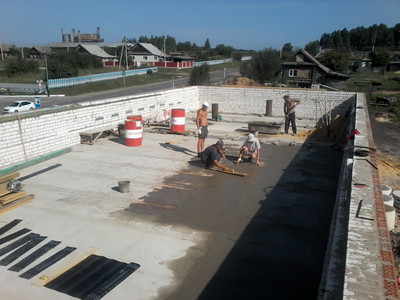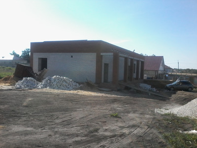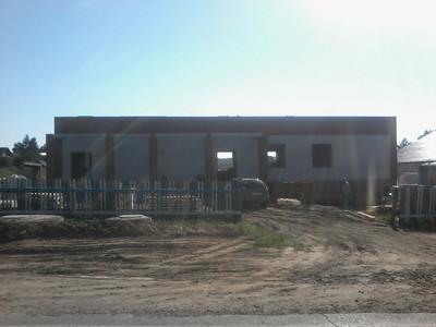 Как видно на фото, возведена основная коробка здания. Делаются перегородки внутри, наружнее водоотведение. Подготавливается крыша под покрытие утеплителем.