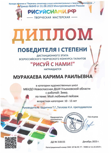 - Муракаева Карима — победитель I степени в категории художественных школ (возрастная категория 10-13 лет);