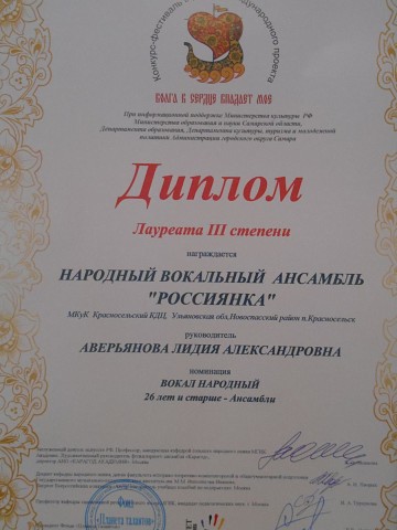 25 ноября в г Самара проходил международный конкурс - фестиваль "Волга в сердце впадает мое" народный коллектив Красносельского КДЦ "Россиянка" принял в нем участие в номинации вокал народный (ансамбли).