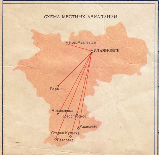 На карте региона, изданной Главным управлением геодезии и картографии Совета министров СССР в 1972 году, есть врезка – «Схема местных авиалиний». Согласно документу, из Ульяновска можно было улететь не только в крупные города, но и в семь населенных пунктов внутри области: Новые Маклауши (Майнский район), Барыш, Новоспасское, Николаевка, Павловка, Радищево, Старая Кулатка.