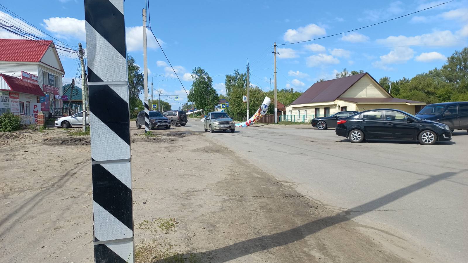 Но, в контексте праздника, данное событие явно не красит соответствующие службы, так мы видим на столбе праздничные транспаранты...