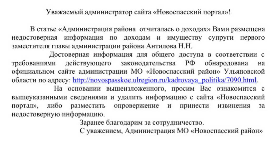 Сегодня на портал поступило заявление от администрации МО "Новоспасский район" по поводу публикации сведений о доходах руководства администрации.