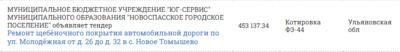 Так, объявлен тендер на "Ремонт асфальтобетонного покрытия автомобильной дороги по ул. Пирогова в р.п. Новоспасское".