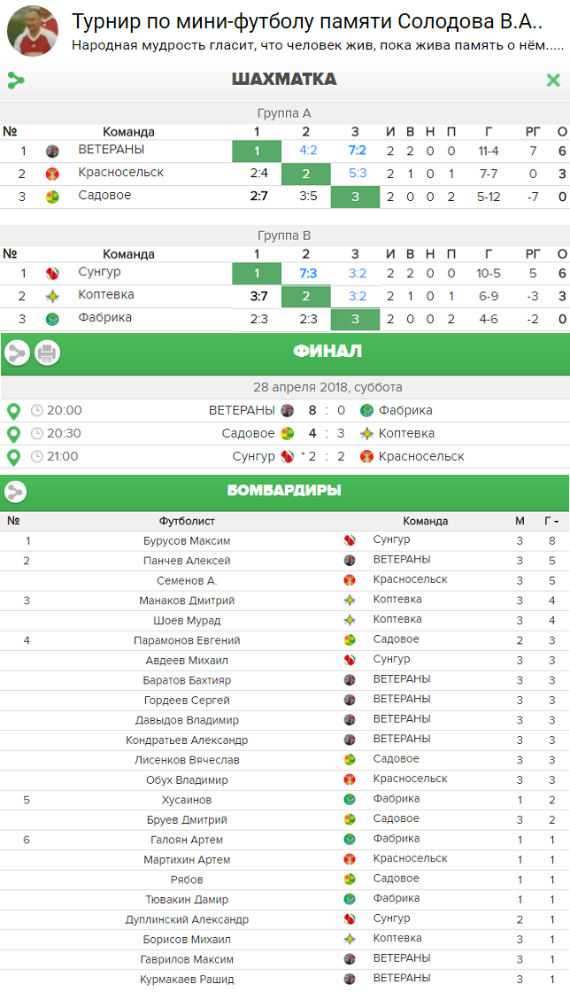 28 апреля 2018 года взял старт второй турнир по мини-футболу памяти Солодова В.А..