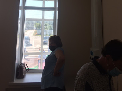 "Находимся в больнице у кабинета терапевта люди сидят все в маленькой комнате и больные и здоровые, вентиляции нет люди не могут пройти терапевта с 8.00 утра!!!!". (запись и фото сделаны в 14 час.!)