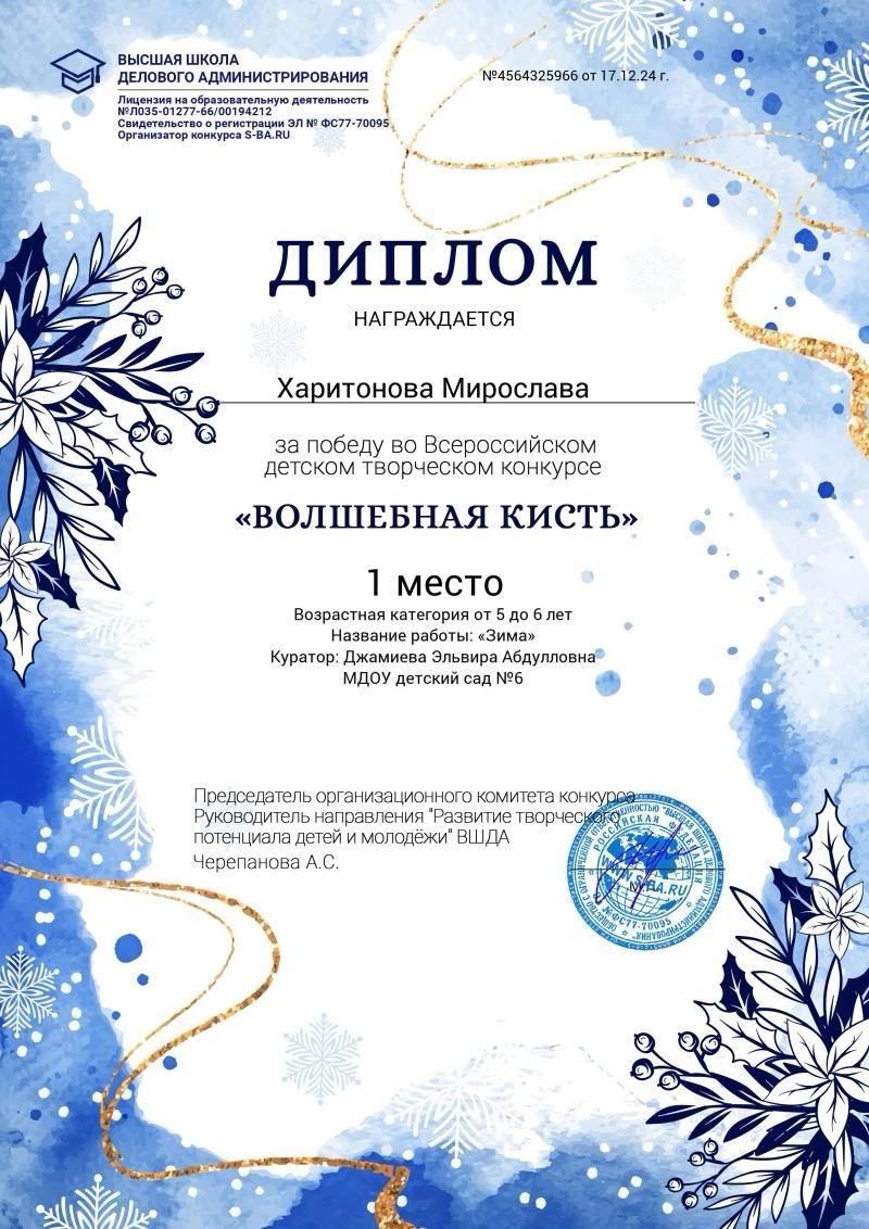 Харитонова Мирослава, воспитанница группы раннего эстетического развития Новоспасской ДШИ, стала победителем Всероссийского детского творческого конкурса "Волшебная кисть" в возрастной категории от 5 до 6 лет с работой "Зима".