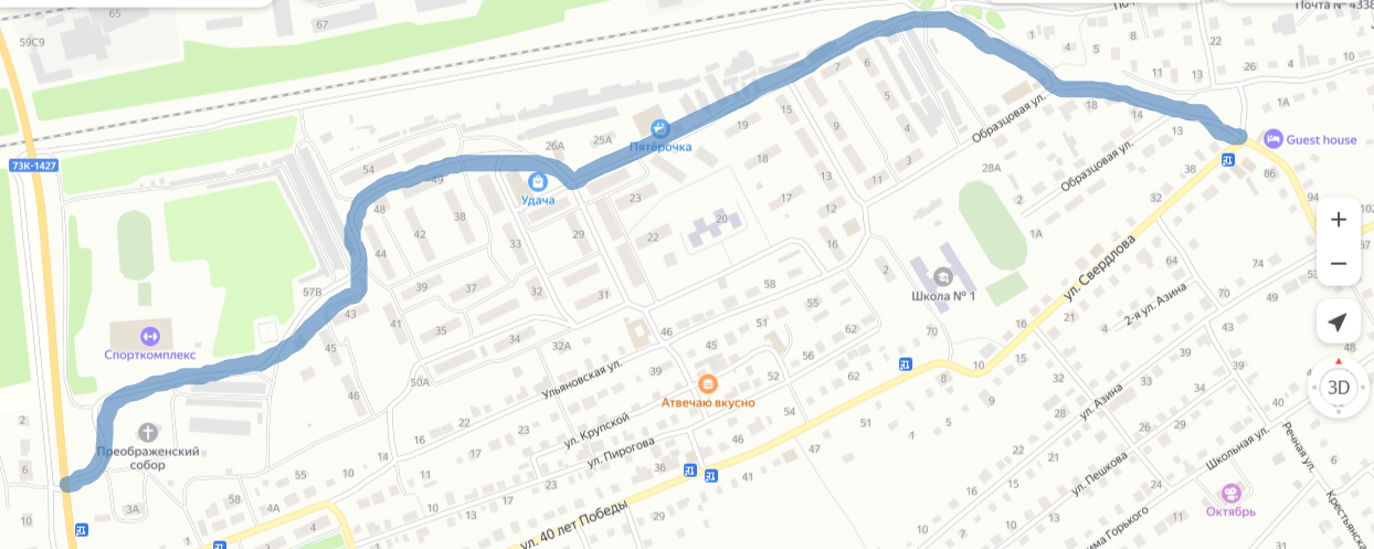 С улицы Азина, автобус вместо улицы Свердлова будет следовать по улице Образцовой до площади Макаренко, далее по площади Макаренко, мимо ТЦ "Удача", ЛДС "Олимп", Преображенского храма, с выходом на улицу 70 лет ВЛКСМ, таким же образом и в обратном направлении.