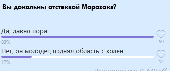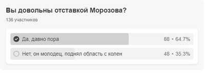 Как видим, большинство и там и там ответили, что Сергею Морозову давно пора было уходить. Что лишний раз подтверждает, что люди устают от длительного нахождения на посту одного и того же лица. К сожалению, не всегда эти лица эту истину понимают... Есть русская поговорка: "всё хорошо в меру".