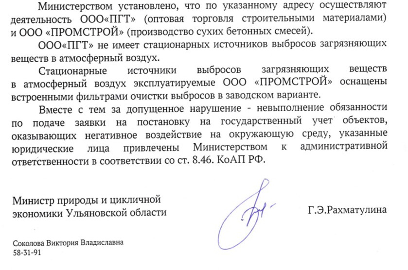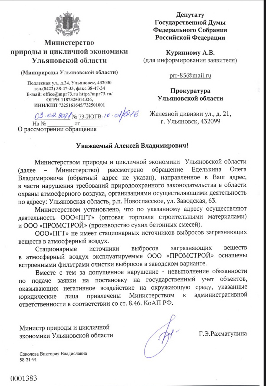 В адрес депутата Государственной Думы РФ А.В. Куринного поступил ответ из Министерства природы и цикличной экономики Ульяновской области на запрос о вредном воздействии предприятий Новоспасского района на экологию.